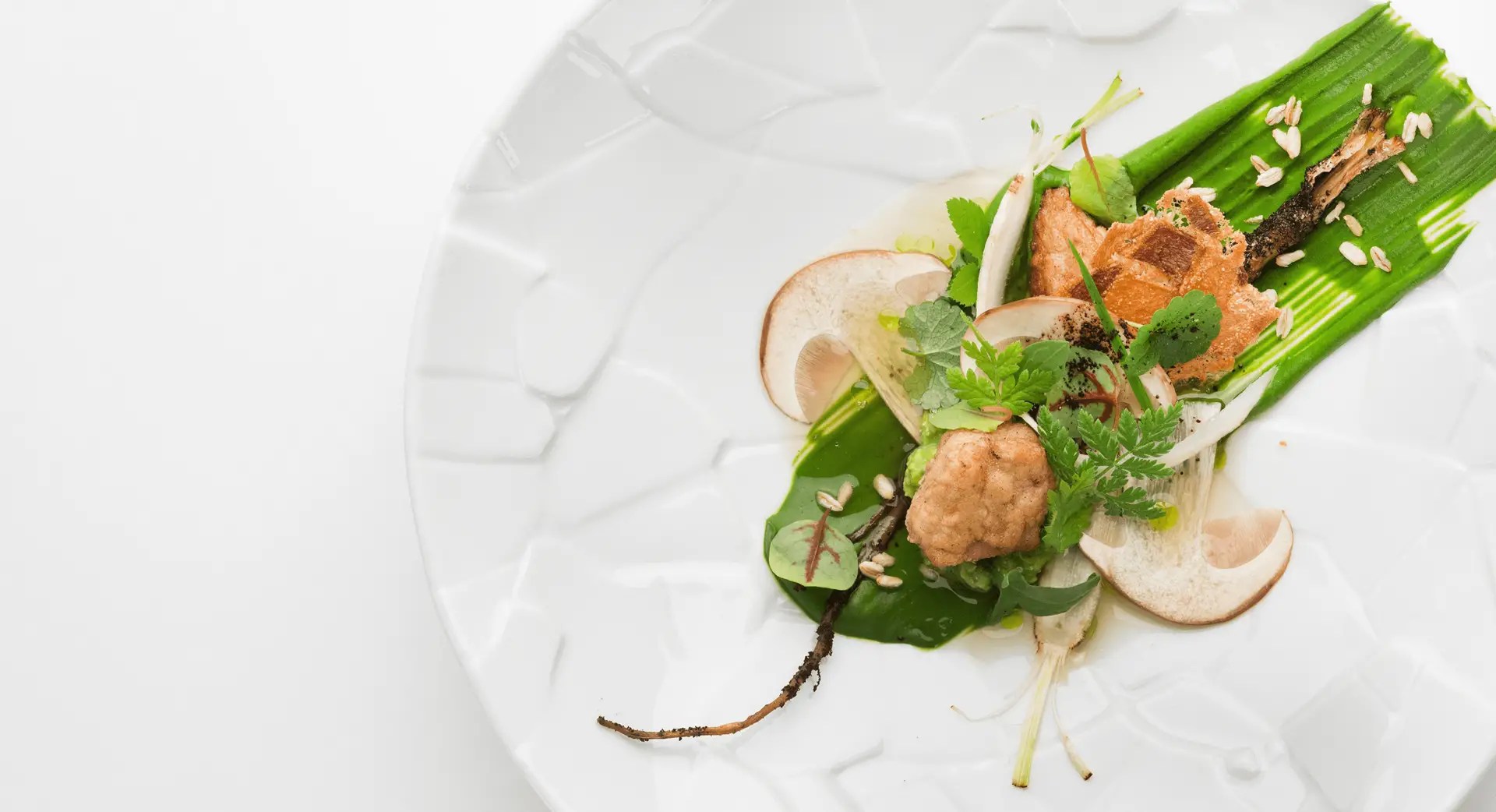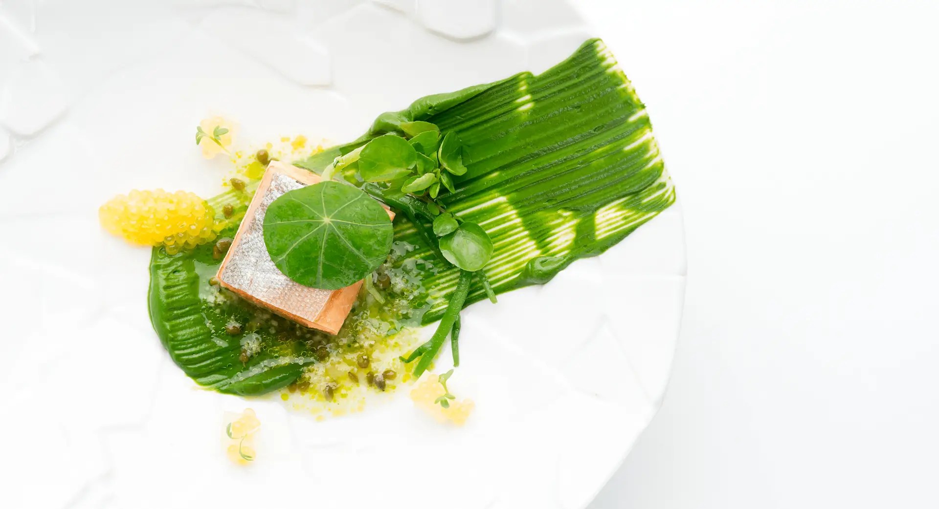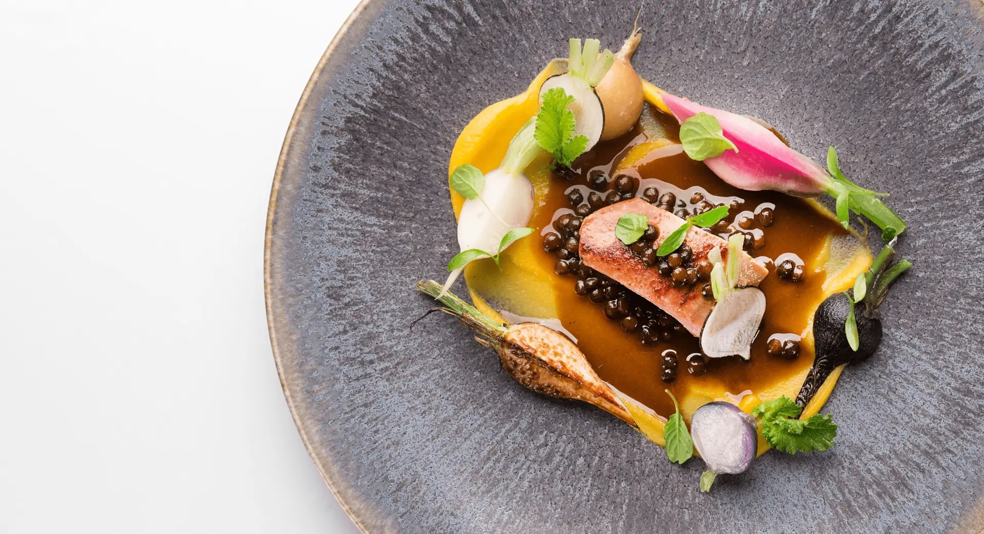Fisch (Aal, Saibling, Rotbarbe, Heilbutt, Meeräsche, Skrei, Steinbutt, Lachs) und Fleisch (Lamm, Reh, Taube, Kalb, Hirsch, Ente, Hase)
